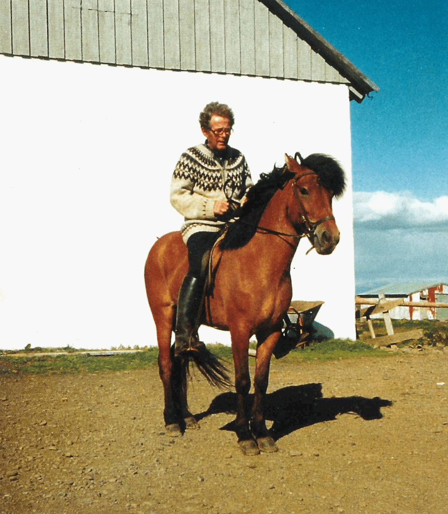 „Einnig hef ég ræktað út frá Golu frá Gullberastöðum sem ég keypti á sínum tíma þegar ég gekk í Skuggafélagðið. Hún var grannbyggð og mikið viljug hryssa. Ég hef haldið þeirri línu fremur aðskilinni og á út af henni núna einn góðan, gráan. Þessar tvær hryssur, Harpa og Gola mynda grunninn að minni ræktun. Ég vil hafa hrossin mjúk, mjúk í baki með gott afturfótaspor og líka fallegt framfótaspor, vel reist en bara eins og bygging leyfir svo ekki verði ofreising. Annars er ég hættur þessu ræktunarstússi núorðið, sonur minn er tekinn við og ég ríð bara mínum reiðhestum. Ég hef nú alltaf reynt að halda hrossaeigninni innan hóflegara marka og hef líklega aldrei átt nema um 14 hross sjálfur í einu, en svo voru einhver fleiri á heimilinu. Núna á ég bara 3 reiðhesta sem ég fer að taka á hús bráðlega.“