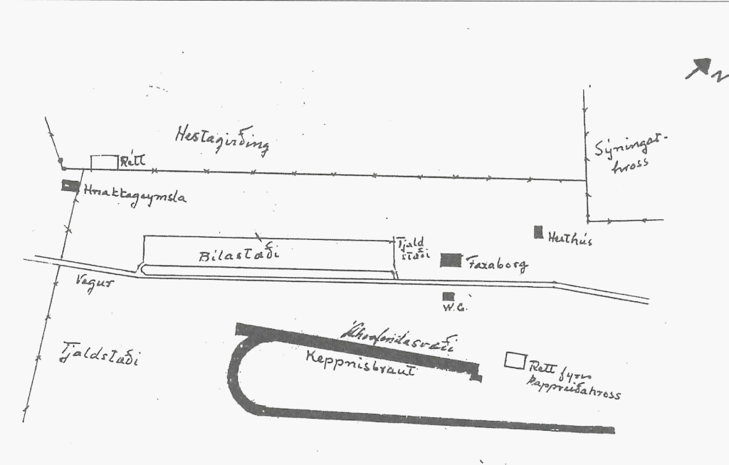 Upphaflega voru kappreiðarnar haldnar á bökkum Hvítár sem var ágætur völlur frá náttúrunnar hendi, en sá galli var á, að engin aðstaða var fyrir áhorfendur, sem urðu að gera sér það að góðu að standa meðfram hlaupabrautinni án nokkurrar upphækkunar. Árið 1948 voru kappreiðarnar haldnar á nýjum stað þar sem merkt er bílastæði á meðfylgjandi teikningu af mótsstaðnum (sjá uppdrátt). Þar hafði verið ýtt fyrir 300 m langri hlaupabraut sem valin var vegna þess að þar fékkst allgóð áhorfendabrekka meðfram brautinni og við enda hennar. Fljótlega kom í ljós að völlurinn var ekki eins góður og menn vonuðu í fyrstu. Fólst það aðallega í því að gróf möl og jafnvel hnullungssteinar gengu upp úr jarðveginum eftir hvern vetur og fór mikil vinna árlega í að raka hann og hreinsa.
