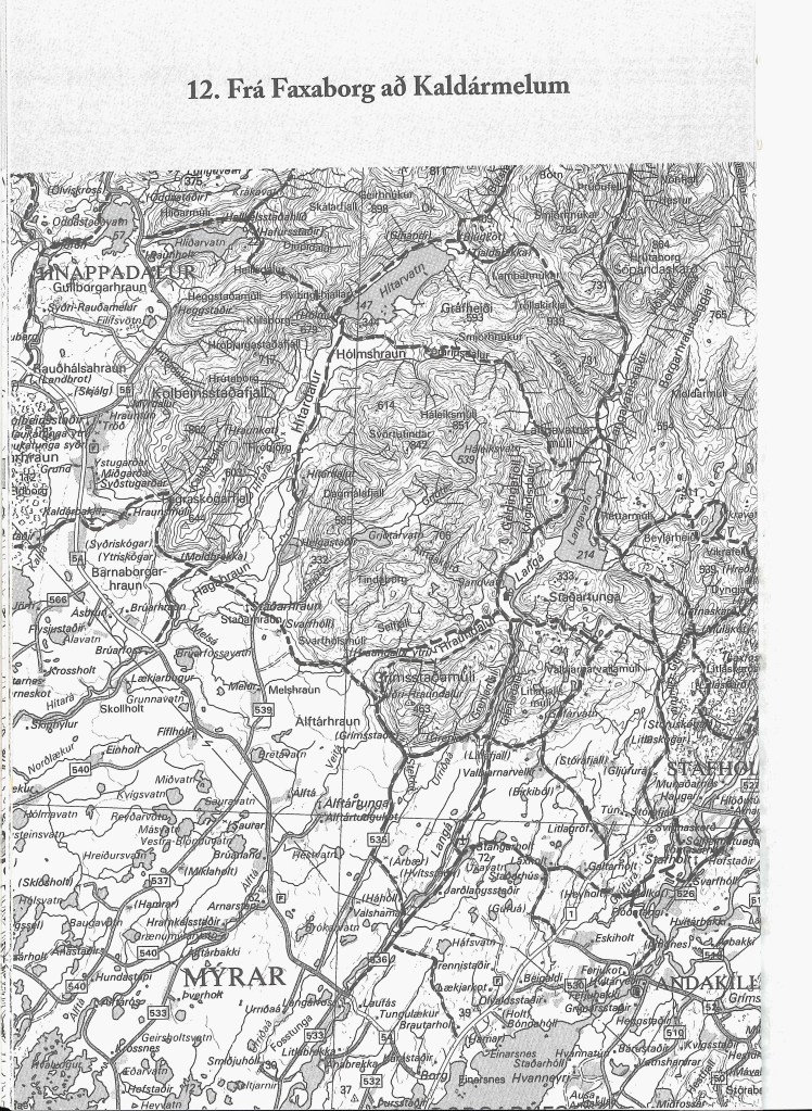 Þegar haldið er frá Grímsstöðum, er um tvær leiðir að velja, svo sem frá Grenjum. Ég ræð fólki án efa að leggja leið sína ofan túngarðs, og er þá rétt að láta hestana fara fót fyrir fót, svo sem kallað var í æsku minni, þegar talað var um fetgang, og virða fyrir sér útsýnið niður Mýrarnar vestanverðar. Þar er um svipað útsýni að ræða og ofan túns á Litla-Fjalli, nema nú blasir við hvert fjallið fram undan öðru, Svarfhólsmúli, Fagraskógarfjall, Kolbeinstaðafjall og Hafursfell, og síðan allur Snæfellsnesfjallgarðurinn með útvörð Snæfellinga og Mýramanna, Snæfellsjökul, í vestri.